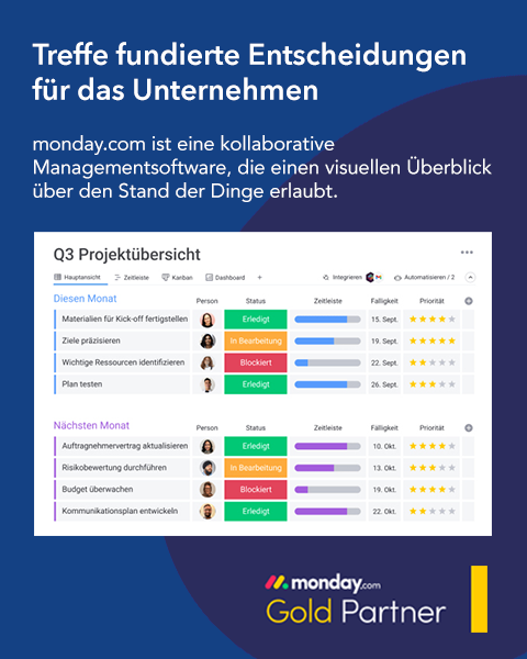 monday.com ist eine leistungsstarke Work-Operating-System (WOS)-Plattform, die Unternehmen bei der Planung, Organisation und Nachverfolgung ihrer Projekte unterstützt. Durch unsere Partnerschaft mit monday.com kann vteeam.com seinen Kunden exklusive Implementierungsservices, maßgeschneiderte Anpassungen und umfassende Schulungen anbieten, um das volle Potenzial der Plattform auszuschöpfen.
